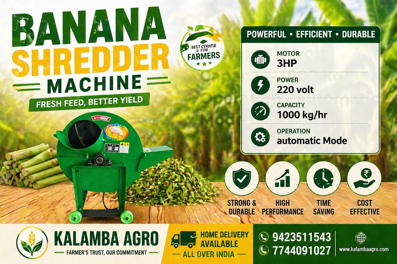 Banana Shredder Machine with 3HP Motor is a powerful and efficient machine designed for fast banana stem and waste shredding. It comes with 220 Volt power supply, 1000 kg/hr capacity, and automatic operation mode. Strong, durable, low maintenance, and ideal for farmers looking for high performance and time-saving agricultural solutions.